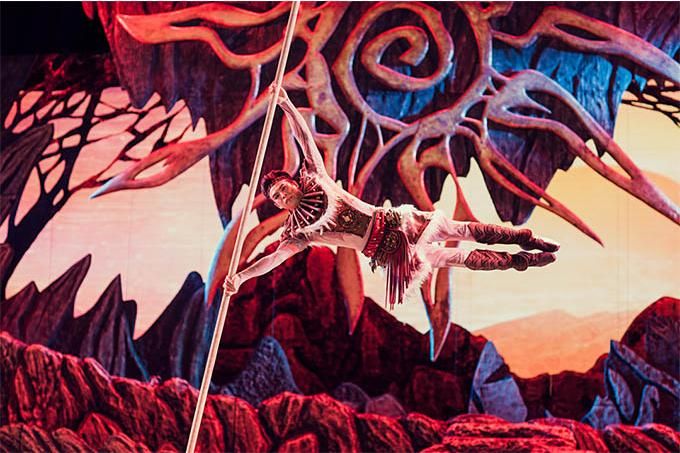 雜技藝術(shù)在劇場空間維度的呈現(xiàn),一是把身體作為一種最為本質(zhì)的符號材料進(jìn)行直接表現(xiàn);二是通過與物體、音樂、舞蹈、燈光、唱詩等的排列組合,展示技藝的身體與物體、空間的關(guān)系,達(dá)到彰顯其生命意蘊(yùn)與美學(xué)品質(zhì)的目的。劇中網(wǎng)吊、綢吊、轉(zhuǎn)動(dòng)桿上技巧等項(xiàng)目非常炫技,展現(xiàn)了現(xiàn)代雜技的審美意境,詩與思在舞臺上相得益彰。綢吊極具浪漫色彩,承載著輪回與終極的生命哲理;智者的“唱詩”,凸顯了該劇的史詩特征,增加地域文化和遠(yuǎn)古歷史的厚重感。