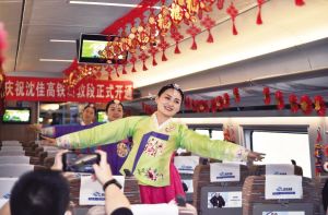 沈佳高鐵長(zhǎng)白山至敦化段開(kāi)通運(yùn)營(yíng),將促進(jìn)沿線旅游業(yè)和冰雪經(jīng)濟(jì)快速發(fā)展,進(jìn)一步加強(qiáng)民族團(tuán)結(jié),助力長(zhǎng)吉圖開(kāi)發(fā)開(kāi)放、深度融入 “一帶一路”。圖為列車(chē)工作人員在車(chē)內(nèi)表演朝鮮族歌舞。 新華社發(fā)