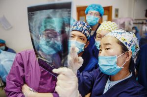 北京援藏醫(yī)生韓同英(右一)在北京市組團(tuán)幫扶的拉薩市人民醫(yī)院對(duì)當(dāng)?shù)蒯t(yī)生進(jìn)行傳幫帶。