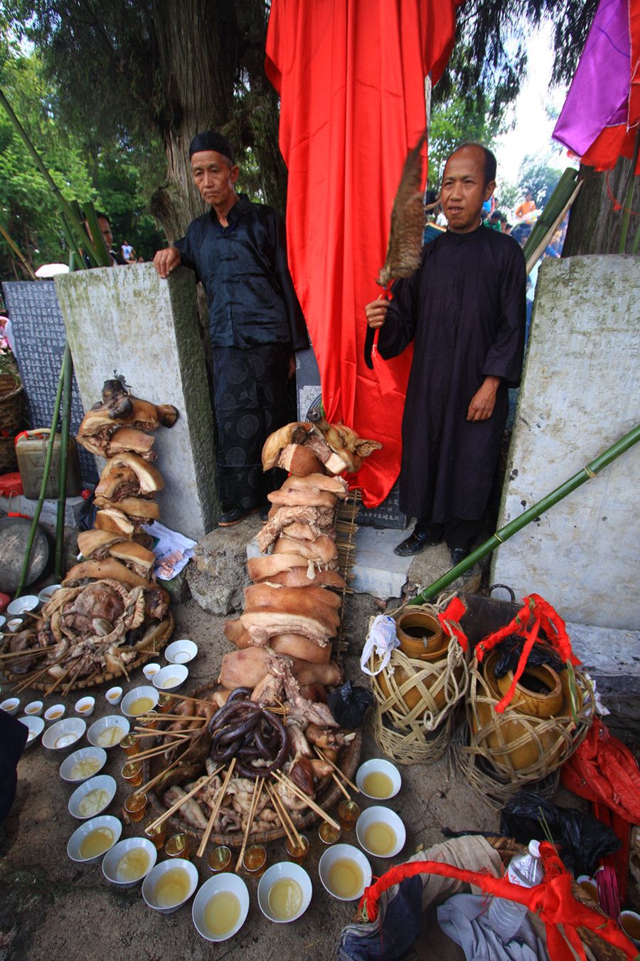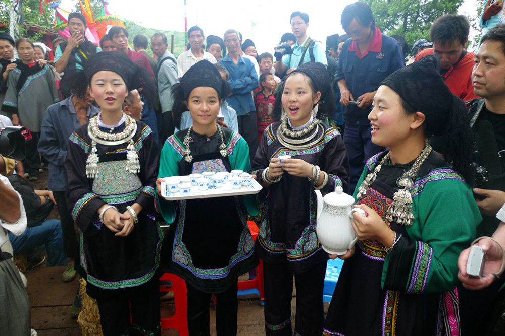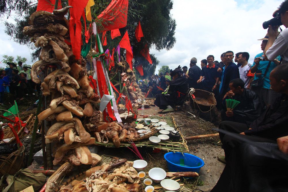 人們傳說只有醉倒了"霞神",它才能永遠留在這方,才能使這里風調雨順。當水書先生念了最后的咒詞,祭典才在鼓樂聲和歡呼聲中結束。最后,各族系將祭肉一并聚攏,聚餐慶祝。天黑之后,人們秘密地將"霞神"收藏起來,至此,"敬霞"活動全部結束。