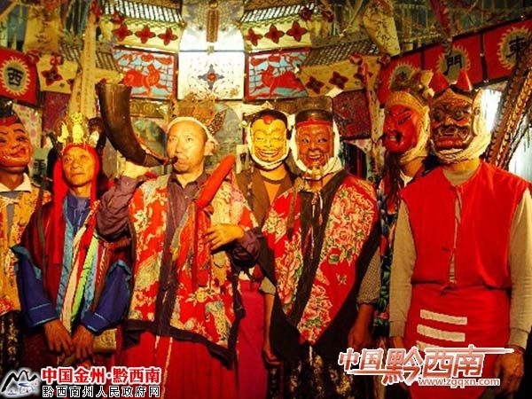 生活在黔西南州貞豐、晴隆、普安、望漠、冊亨、安龍、興義等8縣市的20萬苗族同胞的先民,在遠(yuǎn)古時(shí)代“信鬼不信神”,認(rèn)為人的靈魂不滅,祖先死后靈魂仍在,可以保佑子孫后代。因此,苗族先民往往祈求祖先,助其實(shí)現(xiàn)心愿,一但酬愿便要祭祀祖先,俗稱“還儺愿”。還愿時(shí)舉行的儀式就是儺儀。還儺愿主要由苗巫師主持,跳儺時(shí)配以唱、念及動作,儀式非常莊嚴(yán)肅穆。明末清初民間藝人開始將“還儺愿”的部分內(nèi)容整理、加工、完善后搬上舞臺,便成了儺戲。因此說,儺戲是從莊嚴(yán)的祭祖儀式脫胎而成的一種獨(dú)具特色的地方曲目。儺戲沒有管弦樂,但有節(jié)奏明快的鑼鼓伴奏,曲調(diào)流暢悅耳,劇情風(fēng)趣詼諧,更具有濃郁神秘的苗族文化色彩,深受苗族同胞的喜愛。