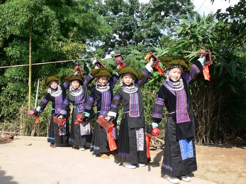 板凳舞,苗語稱:“卡牛檔”。關于它的起源,在黑苗中一直這樣流傳:相傳在很久以前,寨中的男子都參軍打仗去了,剩下老人、婦女和小孩,由于地處高山,深林密布,經常有野獸出沒,婦女們?yōu)榱藟涯?,白天晚上都喜歡聚在一起,用小板凳互相擊打,敲出聲響,驅趕野獸……漸漸地,就慢慢演變成了在當?shù)孛缱鍕D女生小孩辦滿月時,拿小板凳敲擊舞蹈祝福小孩的習俗。