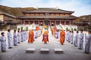 道安法師依外來佛教律法而別立符合中國國情的僧制,為唐代百丈禪師創(chuàng)立清規(guī)開辟了先例。圖為寺院的傳授菩薩戒請師儀式。 河北兜率寺供圖