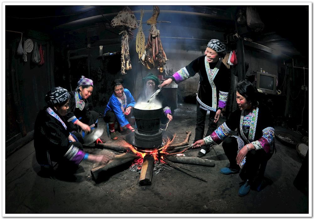 人略施小計,使牛變成草食的家伙,省了口糧。人覺得這樣做對不起牛,所以仍讓牛住樓下老地方,一直住到現(xiàn)在;而且每年四月初八都蒸黑糯飯,殺雞宰鴨過黑飯節(jié),趁機給牛優(yōu)待,開膳時抓一糰黑糯米飯供牛受用,有福同享,略帶“努都弱沙”澀味的染色飯食,不但別有一番風味,還有祛濕消滯清熱的效能哩,營養(yǎng)藥效兼而有之,對人對牛的健康都有好處;還特別給牛預備一捆綠油油的嫩草,有的人家還將一把嫩草吊掛于牛欄門口供牛作節(jié)食。這事著實令人感動,肚有墨水的人給它起了個雅致的名號叫?;旯?jié),意為牛是有靈魂的,它有恩于人,應該三牲享祭,給牛安魂,替牛定魄,并在牛欄兩邊門縫和門口地面焚插鳧鳧香炷,牛欄門頭貼一片到幾、三五片巴掌般寬、七八寸的長方形的紅紙,這玩藝不規(guī)則地染印顆顆金星,下垂一端呈鋸齒狀,微風吹來“皮皮婆婆”地拂動,像一團熱烈跳動的火焰,祈求上蒼保佑牛像這紅紅的火焰一樣,祈求上蒼保佑牛健壯興旺。