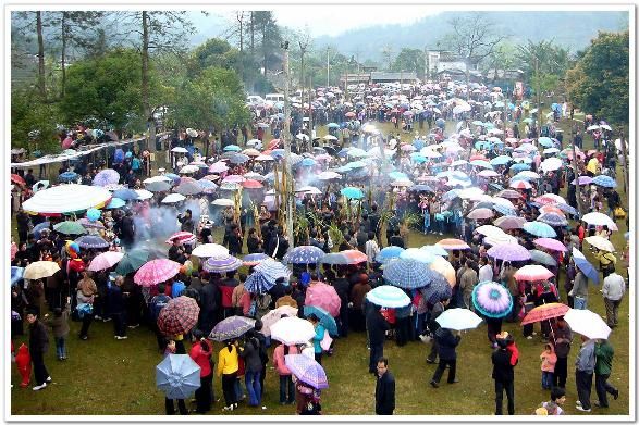 香粉古龍坡會于每年農(nóng)歷正月十六舉行,所以又名“十六”坡。這一天、來自外國朋友、各地的游客及當(dāng)?shù)胤綀A十里的苗哥苗妹,提蘆笙,提鳥籠、牽馬匹,打花傘……朝著十六坡趕來。正午時分,山梁上、村道間、河溪旁,出現(xiàn)了成列成隊穿紅戴綠的人群。遠遠望去,似一條彩帶在飄動。當(dāng)萬余人匯集后,整個坡地就成了彩色的世界。