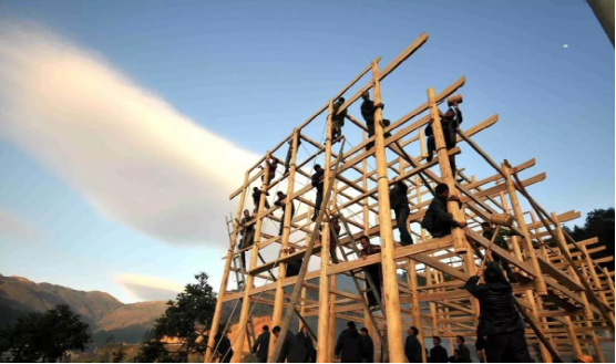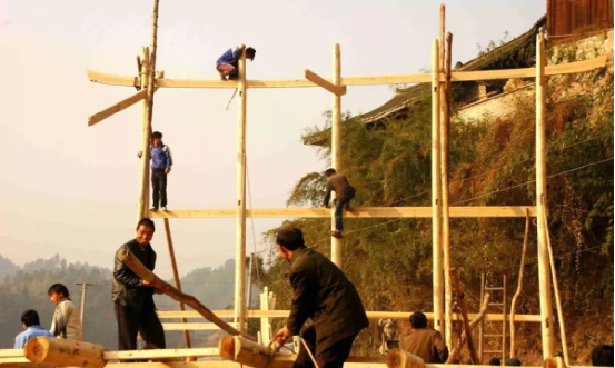 苗寨吊腳樓的修建程序有很多步,有選擇屋基→備料→發(fā)墨→拆枋鑿眼→穿排→立房→蓋瓦→裝扮等多道工藝流程。
