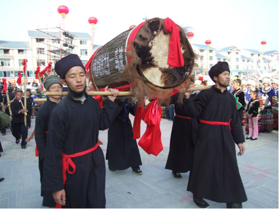 第6天(申日):下午兩三點(diǎn)鐘,保管銅鼓的寨老等人,燒香化紙,燃放鞭炮,用魚(yú)、肉、酒等祭鼓后,先由寨老家人踩幾圈銅鼓,然后全寨男女老少及來(lái)客(主要為女青年)跟著踩。這天,人人穿著節(jié)日盛裝,在蘆笙的伴奏下,踏著鼓點(diǎn),圍圈跳蘆笙銅鼓舞。晚夜,本寨和外寨未婚男女青年在河灘等地“游方”,對(duì)唱情歌,尋覓伴侶。每天晚上的“游方”活動(dòng)持續(xù)到第10天(子日)才結(jié)束,這時(shí)外寨的男女青年才依依不舍離去。
