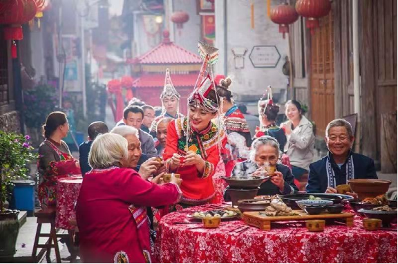 2.畬族婚嫁:婚禮的特色較多。迎親隊伍到村時,嫁方村上女性拿杉木枝欄路,表示晚上要對歌;到中堂時,嫁方請四位男子與迎親隊伍中四人相對作揖,此儀式叫“拾田螺”,表示歡迎;中餐由嫁方請迎親隊伍,媒人就坐中堂席首位,叫“落腳酒”;晚餐由娶方請嫁方親戚朋友,舅公就坐首席,叫請“大酒”;午后,赤郎舉行“借鍋”儀式,赤郎端點紅燭放有一刀肉和兩塊豆腐的米篩向灶神作揖后,用謎語念借所有的炊具,姑嫂們把能藏的炊具都藏起來,念不到就不拿出來,要全部重借,“借鍋”意為娶方借嫁方炊具宴請客人。借好之后,赤郎要殺娶方家挑來的一只公雞用以嫁方“請祖公”,殺雞時,規(guī)定血不許滴到地上,滴一滴地上罰一碗酒;宴席中途嫁方女歌手會起歌頭找赤郎對歌。畬族婚禮的又一個特點是,新娘夜行嫁,卯時進夫家門。行嫁時有牛在前頭踏路,意為新娘一切都要新的,牛踏過的路為新路。以往嫁妝有鋤頭、斗笠、棕衣、線簍、火籠等,體現(xiàn)了畬族婦女熱愛勞動。