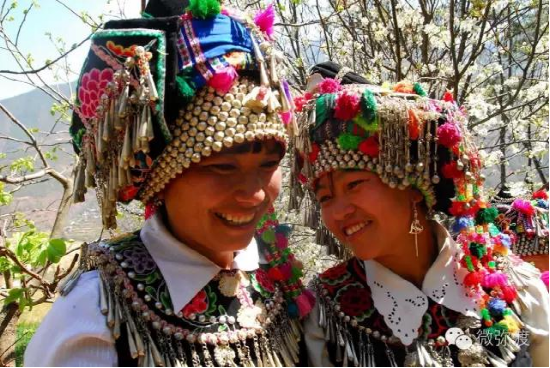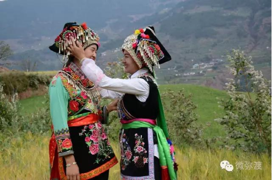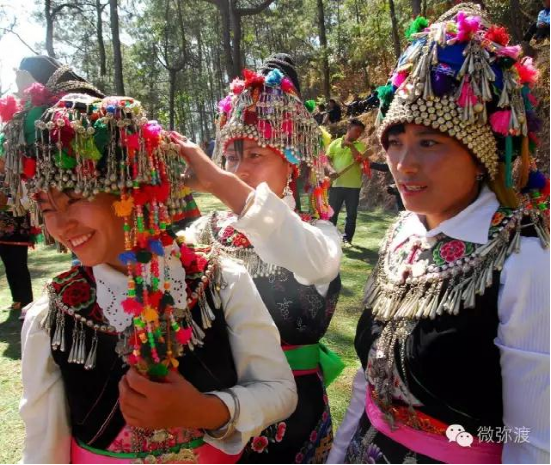 “羅羅潑支”男女服飾的特點(diǎn):“羅羅潑”男子服飾與“迷撒潑”相差無(wú)幾,一般不戴白頭巾。但是婦女的服飾相差卻很大,明顯保留著古樸高雅的南詔遺風(fēng)。頭飾由桂花、包頭、飄帶、大墜子、蜜蜂墜、芝麻鈴組成。桂花墊子在裱布上蒙黑色面料,中間訂有銀飾。包頭以黑色為主,長(zhǎng)約2米,后鏈系于包頭,鏈子為銀制。飄帶長(zhǎng)約4尺,黑色留花邊,兩頭訂英蘇。包頭還系有大墜子、蜜蜂墜各一對(duì),芝麻鈴20個(gè)。領(lǐng)合由裱布黑色面料上訂芝麻玲20個(gè)圍在脖子上。圍腰的前胸部,由領(lǐng)口至腹部,左右各垂掛一條綴有串珠、針筒、響篾(口弦)一類飾品和生活用品的銀質(zhì)項(xiàng)鏈。人一走動(dòng),全身的小蘇鈴就響,聲音悅耳動(dòng)聽(tīng),形象美觀大方。額頭前還圍有一塊翠綠色的“桂花綁”,綁上釘有銀質(zhì)小泡泡200多顆,羅羅潑支婦女的服飾彰顯華麗之美。