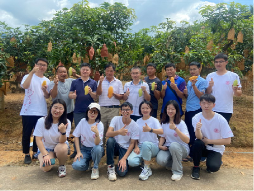一是恩樂(lè)鎮(zhèn)復(fù)興村晚熟芒果基地調(diào)研。9月3日上午實(shí)踐團(tuán)前往恩樂(lè)鎮(zhèn)復(fù)興村晚熟芒果基地考察,了解該基地的主要栽培品種,提出當(dāng)?shù)孛⒐耘嗟膬?yōu)勢(shì)及目前亟需解決的問(wèn)題,并為農(nóng)戶進(jìn)行相關(guān)栽培技術(shù)的講解,為當(dāng)?shù)赝硎烀⒐?xì)化管理提供技術(shù)支撐。同時(shí)實(shí)踐團(tuán)選取不同海拔生長(zhǎng)旺盛、豐產(chǎn)、穩(wěn)產(chǎn)的成年樹,隨機(jī)采摘果形均勻、健康飽滿、無(wú)機(jī)械損傷和病蟲害的成熟果,以及套上不同果袋子的果實(shí),如白袋、紅袋和黃袋,所有樣品采摘后立即送回實(shí)驗(yàn)室,對(duì)其單果重,果實(shí)縱徑、橫徑、厚度、總可溶性固形物、果形指數(shù)及風(fēng)味等綜合性狀進(jìn)行測(cè)定,探究不同海拔和果袋對(duì)芒果果實(shí)品質(zhì)的影響,以期為生產(chǎn)實(shí)踐提供理論指導(dǎo),提高果實(shí)品質(zhì)。