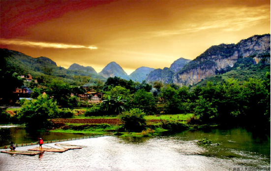 壩美,為壯語譯漢語為:壩—沖口,美—樹 ,因居住的沖口樹木多而得名。壩美村位于珠江流域西江水系馱娘江上游的阿科河畔。屬喀斯特地貌,區(qū)域內(nèi)山峰奇特,河谷幽美,阡陌縱橫,河流山泉蜿蜒奔流,溶洞層疊散布在山體峰內(nèi),冬無嚴(yán)寒,夏不酷暑,氣候宜人。因四面環(huán)山,不通公路,進出寨子主要靠村前村后兩個天然的石灰溶巖水洞,村民們要摸著巖壁趟水、撐竹筏、劃獨木舟、坐小船,經(jīng)過950米長的幽暗的“出水洞”和680米長的“湯拿洞”才能進出。由于地處偏僻,交通不便,基本不與外界交往,多年來壩美村長時期與外世隔絕。壩美村水源豐富,氣候溫和,自然生態(tài)環(huán)境未被污染,負(fù)氧離子質(zhì)數(shù)高出城市數(shù)倍,游人在此休憩,心曠神怡,是一個溫濕潤,四季宜人的旅游勝地。就生態(tài)環(huán)境和歷史淵源來說,《桃花源記》問世1500多年,只聞其名,不見其實。相傳除唐代確認(rèn)湖南省桃源縣的桃源洞為其原型外,目前全國就有冠名“世外桃源”的地名16個之多。而今天的壩美,不僅十分相似,而且還神似東晉文學(xué)家陶淵明筆下所描寫的“林盡水源,便得一山。山有小口,仿佛若有光;便舍船從口入……土地平曠,屋舍儼然,有良田美池桑竹之屬;阡陌交通,雞犬相聞……”的世外桃源。而且在當(dāng)?shù)卮迕裰杏性S多歷史傳說:北宋皇祐四年(公元1052年),壯族起義領(lǐng)袖儂智高在邕州(南寧)昆侖關(guān)被狄青打敗后,退入以其繼父儂夏卿為首領(lǐng)的特磨道(廣南)后,至和二年(1055年),宋朝廷又派楊文廣領(lǐng)兵進剿,儂智高在突出重圍轉(zhuǎn)至阿科(今廣南縣壩美鎮(zhèn)治所)與宋軍周旋,終因寡不敵眾而離開阿科轉(zhuǎn)戰(zhàn)于丘北、開遠、蒙自、元江等地,后到大理不知所終。