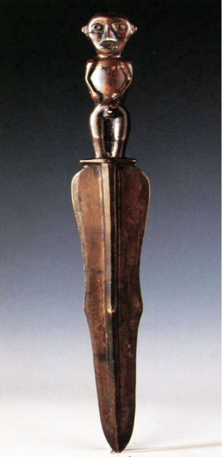 首先是對(duì)當(dāng)?shù)匦率鲿r(shí)代文化因素的繼承和延續(xù),以男女立人形青銅短劍為例,其圓雕人像造型,是對(duì)遼西地區(qū)人形雕塑傳統(tǒng)的繼承。與小河西文化陶塑人頭像、興隆洼文化石雕人像、趙寶溝文化陶塑人頭像、紅山文化陶塑人像、小河沿文化人形陶壺等一脈相承,雖然人像造型和載體略有不同,但未曾間斷,體現(xiàn)了遼西地區(qū)史前文明的祖先崇拜和宗教祭祀禮儀傳統(tǒng)的延續(xù)性。人像造型既是禮制的最高呈現(xiàn),同時(shí)具有標(biāo)志身份和地位的功能。