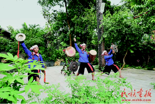 德昂族水鼓舞州級傳承人李三所(右)與村民們一起表演德昂族水鼓舞。