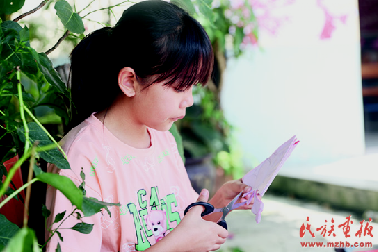 邵梅罕在剪紙藝術館前教孫女們傣族剪紙。