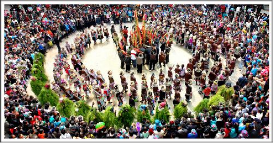 蘆笙踩堂開始時(shí),首先舉行開堂儀式,向蘆笙柱祭祀。蘆笙柱是苗族的圣物,用高達(dá)10米以上的完整杉木制作而成,柱頂立一只錦雞(苗族崇拜的一種鳥),雞頭向東,寓意吉祥;柱身盤著一條金龍,體現(xiàn)苗族與漢族的文化融合;還有苗族崇拜的牛角和十字架。寨老和蘆笙頭分別敬上三杯酒和燒三柱香,感謝神靈和祖宗保佑,祈求坡會(huì)成功、新年萬(wàn)事如意。緊接著,蘆笙頭拿起小蘆笙,圍繞一個(gè)曲調(diào)反復(fù)吹三遍,拉開蘆笙踩堂表演的序幕。