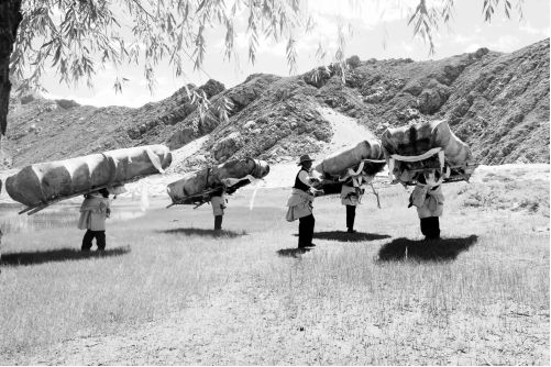 據(jù)當(dāng)?shù)厝私榻B,牛皮船構(gòu)造簡單,用木頭做船架、牛皮做船體。首先采用比較堅硬有彈性的樹木來做骨架,然后把牦牛皮泡在水里,將皮上的毛和肉全部去掉后,用四張牛皮并對縫起來,趁牛皮軟時包在骨架上,同時用牛皮繩子捆緊繃好、曬干、擦油定型,再在牛皮接頭處采用牛、羊油來堵住縫口密封好,避免進(jìn)水。