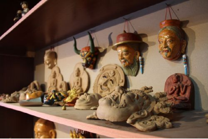 在普布次仁所在的公司里,有一個(gè)專門用來制作泥塑面具的房子,從外表上看去,它只是一個(gè)普普通通的藏式民居,但走進(jìn)其中,則別有一番天地。在房間里整齊擺放了大大小小的泥塑面具、佛像,這些手工藝品造型生動(dòng),每一件手工藝品仿佛都在訴說著一個(gè)古老、動(dòng)人的故事。