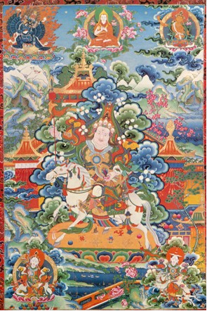 勉塘畫派是15世紀(jì)以后影響最大的繪畫流派,主要流行于衛(wèi)藏地區(qū)及昌都部分地區(qū)。該畫派的創(chuàng)始人是勉拉頓珠,他出生于洛扎勉塘(今山南地區(qū)),勉塘畫派由此而得名。他大約出生于公元十五世紀(jì)20年代或30年代。據(jù)史料記載,勉拉頓珠出生的時(shí)間正好與他家鄉(xiāng)發(fā)現(xiàn)了朱砂礦的時(shí)間一致。這種重要繪畫顏料的出現(xiàn),預(yù)示著一代繪畫大師降臨人世。他自幼聰慧,毫不費(fèi)力地學(xué)完各種字體的書寫、大小五明中的絕大多數(shù)內(nèi)容。成年后,拜后藏一帶的著名美術(shù)大師多巴扎西杰布為師,苦心鉆研,在繪畫藝術(shù)領(lǐng)域取得了很深的造詣。通曉了藏、漢、印、尼泊爾等各種繪畫派別的技法,他根據(jù)《續(xù)部》等編寫了繪畫理論專著《造像量度如意寶》,并創(chuàng)立了勉塘畫派。他參與了一世達(dá)賴?yán)锔刂彀团c1447年創(chuàng)建的扎什倫布寺措欽大殿壁畫繪制工程的全過(guò)程,單獨(dú)完成了北壁的《釋迦牟尼與十六羅漢圖》與《八十大成就者環(huán)圍金剛持》兩幅壁畫,在西壁勉拉頓珠親手繪制了《釋迦牟尼十二宏化圖》的白描部分。另外在該寺以及同時(shí)代建造的諸多廟宇繪制完成了大量的壁畫、巨幅堆秀唐卡及小型唐卡。其中最負(fù)盛名的是扎什倫布寺的巨幅堆秀唐卡《釋迦牟尼》,其大小約為長(zhǎng)32.9米、 寬19.3米。該畫派造像法度精嚴(yán),與傳統(tǒng)的表現(xiàn)手法相比,尤其注重線條的運(yùn)用,線條工整流暢,色調(diào)活潑鮮亮,變化豐富,人物體態(tài)、骨相和肌膚都異常完美,脖頸較長(zhǎng),高度和諧的色彩和色調(diào)的配制十分突出。畫面暈染充分,用色細(xì)膩、柔和、富麗堂皇。由于石青和石綠色突出,從遠(yuǎn)處看,繪畫作品十分優(yōu)美和靜。衣袍和飾帶呈不對(duì)稱形式,棋格使構(gòu)圖消失,諸神位于云端風(fēng)景之中,布局活躍多變,背光中卷草圖案等變成了波浪式放射的金線,該派擅長(zhǎng)表現(xiàn)和靜類神像。