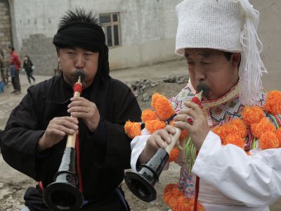 貴州貴陽(yáng)苗族婚禮上的奏樂(lè)