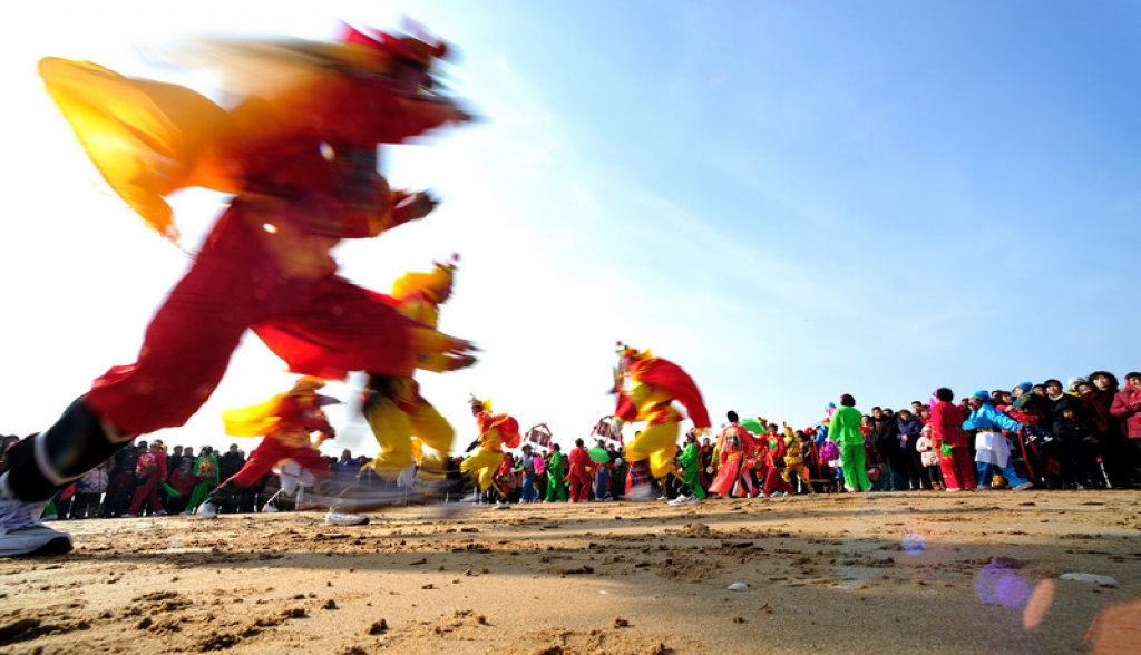 秧歌是春節(jié)群眾歡慶活動中,起著承前啟后、烘托氣氛的大型歌舞形式。這里所指的“秧歌”不僅是單一的“秧歌舞”,而是包含著數(shù)十種歌舞形式所組合的文藝演出隊伍。這支隊伍既要在走街串巷中做行進表演,又將最后集中于廣場做正式的歌舞演出。因此在北方,人們索性就把過去有著祭祀色彩,而今完全成為春節(jié)娛樂式的民間文藝形式稱為“社火”或“秧歌”,把這支浩蕩的隊伍統(tǒng)稱為“秧歌隊”。秧歌隊最前方,在高舉象征來年風調(diào)雨順大傘的藝人率領(lǐng)下,“龍舞”“獅舞”舞隊位列隊首;接下來是一組手揮彩綢翩翩起舞,走“雙葫蘆”“繞菠花”各種圖案的“大場”表演隊;然后是腰間橫挎紅色腰鼓、踏著激越鼓聲的“腰鼓隊”,表演著令人眼花繚亂的“回頭望月”等套路;再后面是腰系竹馬或旱船,扮演新郎送媳婦回娘家的“跑驢”或“跑旱船”;接著是腳踩丈八高蹺、穿戲裝、彩繪臉譜的“高蹺隊”。接下來還有名為《火盆架子》的隊伍,那是把冬季用于取暖的炭盆架,用繩子將其高于腳面懸掛在肩上。盆架以綢布、花草裝飾,表演者戲裝打扮,表演一段段膾炙人口的戲曲節(jié)目。他們被歡天喜地、熙熙攘攘的人們擁簇著一同前往最后進行表演的廣場。由各個村鎮(zhèn)陸續(xù)舉行的這種熱烈而歡騰的歌舞慶祝形式,將貫穿在整個春節(jié)期間,直到正月十五“燈節(jié)”。