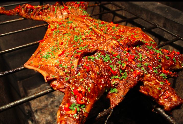 全羊是蒙古族在喜慶宴會(huì)和招待尊貴客人時(shí)使用的食品。蒙古語把全羊叫“首思”。在宴席中如果上全羊,則稱全羊席。在全羊席中,一般是在食客吃了牛羊肉制的冷熱菜正趨興奮之時(shí)上全羊。一種是讓客人觀看后撤回廚房,把皮層肉片切成半寸寬、二寸長的方塊,放在大盤內(nèi),再把貼骨肉切好,一同上桌。另一種是廚師當(dāng)客人的面切塊。一般上烤全羊后,隨上蒙古包子和大米飯、羊骨湯。
