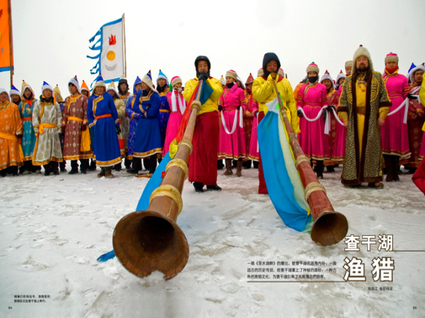 據(jù)記載,一千年前的遼金時(shí)期,這里就是天然的漁獵之地。傳說遼帝圣宗喜吃“冰魚”,每年臘月,便率領(lǐng)家眷浩浩蕩蕩來到冰凍的查干湖上扎營。遼帝在行宮中接見大宋使臣,商談國家大事,會(huì)見部落首領(lǐng),命令仆人將帳篷里的冰層刮薄,直至薄如紙片,冰下游動(dòng)的魚清晰可見。吃飯時(shí),便將薄冰輕輕擊破,水中鮮活的魚兒會(huì)急不可待地跳出冰面,歷史上 把這種捕魚方式叫“春捺缽”。