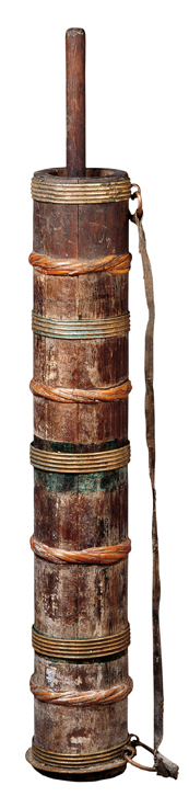 酥油茶是藏族最普遍的飲料。一日三餐、接人待客,都離不開酥油茶。酥油茶的制作各地不盡相同,西藏人打酥油茶時(shí),先將磚茶熬成茶水濾掉茶葉,在特制的酥油桶內(nèi)放適量的酥油、鹽和開水,再將茶水倒入酥油桶內(nèi),然后用特制的木棒上下攪拌,直到茶水和酥油完全相溶即可。而甘青一帶藏族是先將茶盛在碗里,然后加酥油,喝時(shí)一邊吹碗邊的油,一邊喝,添數(shù)次茶水后,酥油也喝完了(圖為打酥油茶桶)。