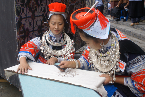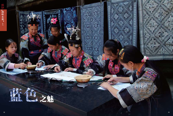 蠟染是貴州省丹寨縣、安順縣、織金縣苗族世代傳承的傳統(tǒng)技藝。 丹寨縣、安順縣及織金縣是以苗族為主體的多民族聚居區(qū),在長期與外界隔絕的艱苦環(huán)境中,這里的居民逐漸形成了自給自足的生活方式,古老的蠟染技藝因此得以保留下來。按苗族習俗,所有的女性都有義務(wù)傳承蠟染技藝,每位母親都必須教會自己的女兒制作蠟染。所以苗族女性自幼便學(xué)習這一技藝,她們自己栽靛植棉、紡紗織布、畫蠟挑秀、浸染剪裁,代代傳承。在此狀況下,這些苗族聚居區(qū)形成了以蠟染藝術(shù)為主導(dǎo)的衣飾裝束(以上三照片由劉軍提供)。