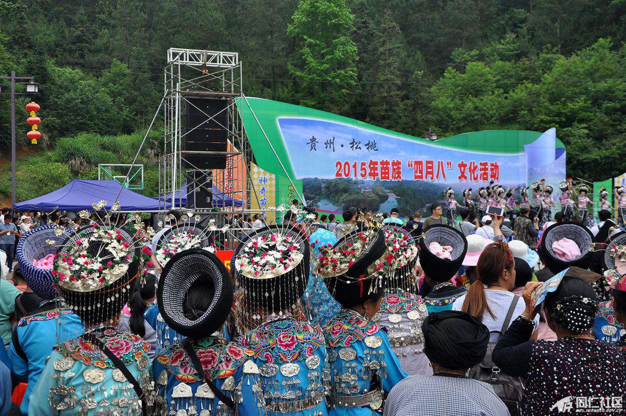 “四月八”的由來傳說甚多,主要是為憑吊“四月八”葬于今噴水池一帶的古代苗族英雄,輩輩相傳,而成習(xí)俗。傳說古代有一個名叫“亞努”的苗族首領(lǐng),領(lǐng)導(dǎo)苗民向統(tǒng)治者進(jìn)行斗爭。他曾組織各寨苗族頭人在“喝血坳”地主喝雞血,發(fā)誓共同聯(lián)合,戰(zhàn)斗到底。并約定四月八日在某山聚眾起義。起義后,義軍連連獲勝,一直打到了四川、貴州。第二年的四月八日,亞努不幸戰(zhàn)死在貴陽市的噴水池附近。苗族人民為了紀(jì)念這位民族英雄,便于每年的四月八這一天,舉行紀(jì)念活動,追思亞宜的業(yè)績,為戰(zhàn)死者掃墓。清代乾嘉苗民起義后,統(tǒng)治者禁止湘西苗族人民舉行這一活動,新中國成立后經(jīng)國家民委批準(zhǔn),將“四月八”定為苗族統(tǒng)一的節(jié)日(圖為2015年貴州松桃苗族“四月八”節(jié)慶盛況,引自貴州銅仁政府網(wǎng)“同仁社區(qū)”)。