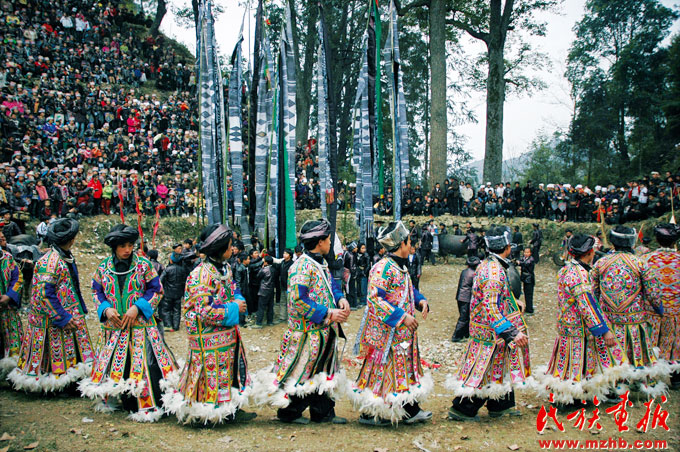 苗族的歲時節(jié)慶獨(dú)特鮮明。傳統(tǒng)節(jié)慶按功能可分為:物質(zhì)交流節(jié)慶;男女社交、戀愛、擇偶節(jié)慶;祭祀性節(jié)慶;紀(jì)念性、慶賀性節(jié)慶。
