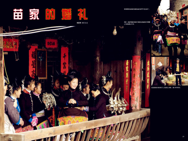 第二天是新娘出嫁的日子。早上七點,新娘的姑嫂和姐妹就早早地來到新娘家為新娘梳妝打扮,有的給新娘梳頭,有的給新娘穿衣,有的給新娘佩帶銀飾,女孩子們唧唧喳喳一陣熱鬧。經(jīng)過一個多小時的梳妝打扮,新娘就要出門了。