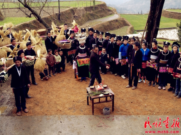 送親隊伍來到新郎家的寨口,寨老為新娘主持“回喜神”儀式