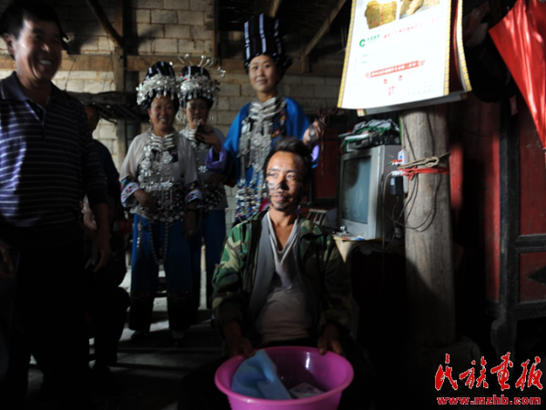 姑娘出嫁必須有娘家人陪送,婚禮這一天清早,“新娘”便在“接親客”的帶領(lǐng)和送親隊(duì)伍的陪同下,一路歡聲笑語(yǔ) ,浩浩蕩蕩向“新郎”家走來(lái)。走到新郎家村邊,有的燃放鞭炮,一直燃放到新郎家門口,請(qǐng)新郎父母出來(lái)開門;無(wú)鞭炮準(zhǔn)備的,則在寨邊稍候,由迎親伙伴飛報(bào)新郎家做好迎親的準(zhǔn)備。男方父母聽到后,多數(shù)是很高興地喊醒家中兒女,由新郎的妹妹或堂姐妹為迎親主體,加上寨上的姐妹和房族組成迎親隊(duì)伍,打開大門,把新娘迎進(jìn)家來(lái)。接親的主要儀式是接傘。接傘的人必須是新郎的小妹或堂妹。無(wú)親妹、堂妹者則由新郎父母指定一與新郎同輩份的小姑娘去接。新娘走至大門,即由新郎的妹妹跨出門外迎接新嫂子,新嫂子接著用左手把雨傘遞給接傘的妹妹,接傘妹妹接過(guò)新嫂子手中的雨傘后,新娘即用左腳跨進(jìn)屋內(nèi),以示今后成為新家庭的主婦。隨即由接傘妹妹攜新娘手迎入新房,迎親婦女們陸續(xù)進(jìn)入新房休息。入門后,新郎家的“陪娘”及姑娘們便熱情地安排“送親客”團(tuán)團(tuán)圍坐,并簇?fù)碇靶履铩本o靠堂屋中柱子就坐,意為“新娘”從此當(dāng)家立業(yè),將來(lái)就像中柱子一樣,頂大梁,撐起這個(gè)家。