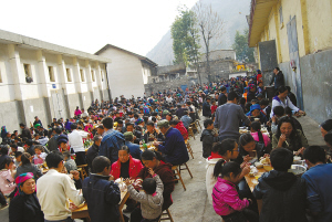 每年秋收后到翌年播種前,是四川涼山金陽縣人結(jié)婚的黃金季節(jié)。無論是在縣城還是農(nóng)村,不管是吃“九斗碗”,還是吃“坨坨肉”,大家都喜歡擺壩壩宴。在金陽縣城,常常可以看到這樣一幅景象:數(shù)百人聚在一處,圍坐于一張張方桌旁,伸箸暢食,舉杯暢飲。一盆盆肉端上桌子,主人不停地招呼客人趁熱吃?! ?/p>