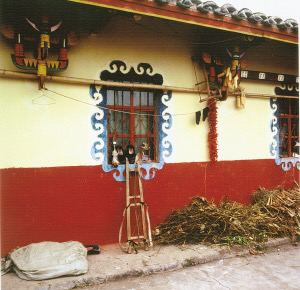 四川昭覺彝民民居獨有的牛頭裝飾。最能展現(xiàn)彝族建筑特色的要數(shù)前屋檐的挑拱了。屋檐的裝飾在建房時從墻上穿枋垂柱形成,少則3層,多則5層,上層垂柱上雕成牛角形托起屋檐的橫梁,下層垂柱上雕有形象逼真的裝飾牛角,垂柱的卡槽為牛蹄形、馬牙形,蹄尖向內(nèi),以示招財進寶。穿枋向上彎曲,與垂柱的牛蹄呼應(yīng),傳統(tǒng)的穿枋雕刻日月星辰、飛禽走獸和條形圖案。