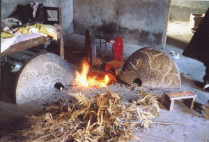涼山彝族獨特的“鍋莊石” 。彝族的火塘為全家的生活中心,進食、取暖、照明、會客、議事等都圍著火塘進行?!板伹f”由3塊石頭支撐,一般在房屋建成前就請石匠打造好鍋莊石。其石料選取沒有污垢而又無缺陷的青石,鑿成厚10厘米左右的變異扇形,上面刻有龍、火、日、月、魚、鳳等古樸傳神的浮雕圖案。日常生活中,一般在鍋莊“上方”(火塘里側(cè)至墻壁)設(shè)矮床。