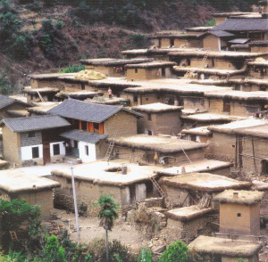 土掌房屋頂 云南楚雄地區(qū)的土掌房,是土墻、土頂、外墻和底層無窗的兩層樓房。有的內(nèi)院也蓋屋頂,稱“無內(nèi)院式”。設(shè)天窗采光,屋頂還能當(dāng)曬臺。整個村落沿山坡而建,巷道很窄,遠遠望去,你家的屋頂是他家的院壩,只要上了一家屋頂,就能靠活動的木梯自由往來。