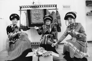 喬進(jìn)雙梅(左一)和當(dāng)?shù)氐囊妥謇C娘們一起交流刺繡技藝。