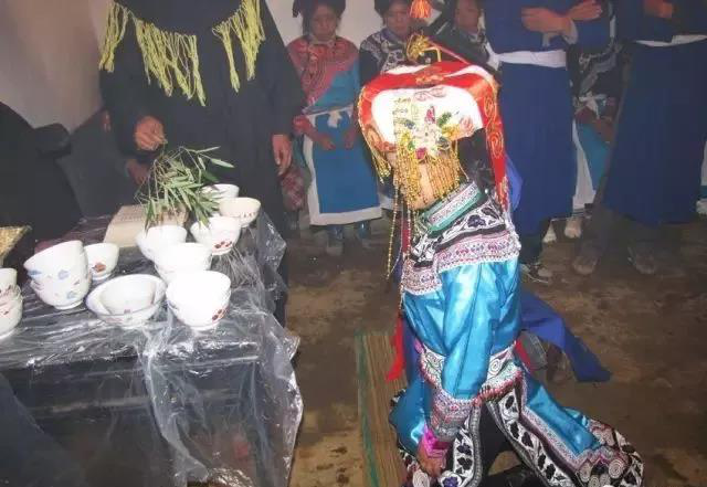 2、源自于民族歌舞文化習俗。彝族是個能歌善舞的民族,自古就有以歌作媒,用歌表達對異性的愛慕和追求的傳統(tǒng)。相傳,彝族先祖篤彌時,洪水淹沒了世界,而篤彌按照天神策舉祖的授意,躲進自造的木桶中幸免于難,成了世間的獨人。天神為了不讓人種在世間滅絕,于是就安排天上三仙女尼友咪比、婁友咪多、吞友武吐下凡到人間,在唄谷懇嘎這地方設歌場,與篤彌唱歌又跳舞,談情又說愛。整個歌場上,熱鬧不一般:天上的仙女,成群來歌場;野人拿舞具,老虎打燈籠;人熊吹蘆笙,歡聚在歌場。彝族的先祖,就是通過歌舞迎得了仙女的歡欣的而成就婚姻而繁衍了彝人的。從此,彝族青年談情說愛、談婚論嫁,都離不開歌舞。歌舞逐漸地融入了婚禮場中,與婚禮上的各種儀式進行對接和植入,通過上千年的發(fā)展,就形成了“阿買懇”。“阿買懇”中的“阿買”指未婚女子,“懇”有“歌舞”、“跳舞”之意。如“唄谷懇嘎”中的“懇嘎”就是歌舞場壩的意思;“懇合”(鈴鐺舞蹈)中的“懇”也有跳的意思;還有“懇咪”,指的是關于歌舞的詩文??梢?,“懇”(歌舞)的內容是相當豐富的,因而彝族出嫁時有出嫁歌,這完全是在情理之中的。