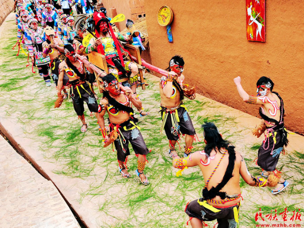 恭請大啞巴的儀式上,羅支全部到齊。羅支就是眾老啞巴,為首的被稱為畢摩。彩繪時,以不同的圖案分別繪在臉部的右上方作為家族和輩分區(qū)別。儀式上,六位畢摩在護衛(wèi)總管的護衛(wèi)下,依次點香叩首。畢摩大聲喊“請啞巴出山嘍”。然后四個壯實的中啞巴用扎好的彩轎抬著大啞巴游街,其余啞巴打歌跟在后面。最為活躍的是畢摩的跟幫,也稱為“馬彷”,他們以倒退的方式,邊跳邊引導行進的隊伍。啞巴隊從村頭到村尾,通過祭拜龍樹、祭鼓,經(jīng)過“三請三唱三起號”,將大啞巴請到廣場,隨后開始了具有濃厚文化底蘊的啞巴舞表演。