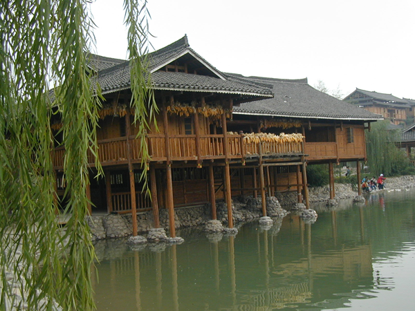 壯族多聚居在崎嶇的山區(qū)和群峰之間的丘陵地帶,壯族人民因地制宜創(chuàng)造了獨居特色的干欄式建筑。壯語稱屋為“欄”或“干欄”。干欄建筑使用木(或竹)柱做成離地面相當(dāng)高的底架,再在底架上建造住宅。樓上住人,樓下豢養(yǎng)牲畜和貯存物件。這種住宅適于潮濕多雨,地勢不平的南方山區(qū)。