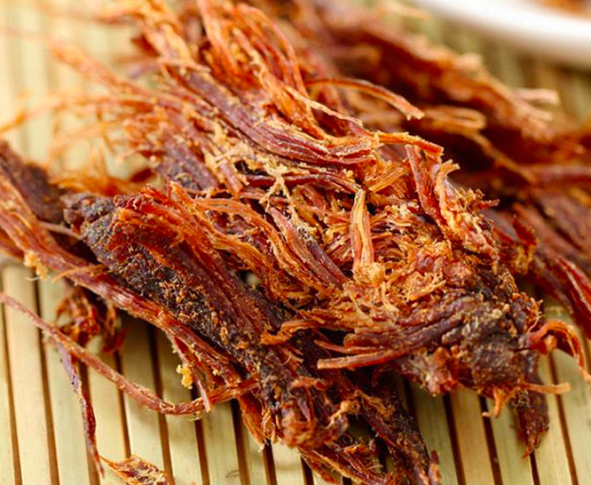 火燒干巴的吃法不復(fù)雜,不加任何輔料,不加任何味道,撕開(kāi)肉絲即可食用。如果覺(jué)得干,可以涼拌一盤(pán)黃瓜輔之,風(fēng)味更甚。剛燒出來(lái)的干巴,香且脆,味勻,擱置太久,會(huì)回軟,失去其原有的香脆可口的口感。