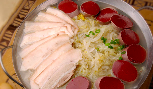 滿族有灌制血腸的習(xí)俗。多在臘月殺豬時(shí)制作。用豬血,加鹽、姜、辣椒粉、味精的調(diào)勻,灌入豬小腸之中,所用腸以不足二尺為宜,兩端用細(xì)繩扎牢,血漿不可充的太滿,以免煮時(shí)脹裂。煮到一定程度時(shí)要用一干凈的鋼針在腸上刺一些針眼,一則排放氣體以免膨脹迸裂,二則掌握火候,一俟沒有血水自針孔洞中滲出,即撈出冷開水或冷水中。食時(shí)片成片,可以直接夾食,也可以醮以醬油、醋、蒜泥、姜汁、辣椒油等食用。既鮮美爽口,又多食不膩,佐酒下飯均宜。
