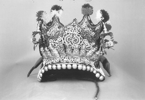 繡花帽由里外兩部分組成,素有“制做繡花帽,先做好襯套”之說。即先按兒童頭徑大小制襯套,做法較簡單,用染過的家織布做里襯,鋪上薄棉,外層為紅綢面,用線依次納緊,以防棉花下滑,縫成筒狀后,頂部用同樣的材料剪成四方形,與上部帽沿結(jié)構(gòu)相同即成。后部分較前部分復(fù)雜,先將染過的兩層家織布粘牢,表面貼上各色緞面,顏色自定。把圖樣拓在緞面上,剪下形狀不同的6片材料,把喜愛的圖案描繪在上面,接著用紡車紡出6根各4米長的棉線,用吊砣逐根旋轉(zhuǎn)纏繞白色呢絨線,經(jīng)濃縮,每根僅得到1米左右線料,將這制好的精線按圖案盤弄,后以花針固定,再輔以其他色線刺繡成圖案點綴其間。把繡好的6片材料組合到襯套上,各片邊沿用黑白兩色線交替鎖邊,帽口用黑金絨布滾邊。此時,帽頂?shù)模吨患饨怯貌噬€制做成圓球裝飾,外面四角下面懸吊白色珍珠串,末端垂著布制五角星。帽的周邊釘上銀制品,最后鑲上反光小圓點飾物似天上星星般光亮,給本就精致美觀的繡花帽增添了一道靚麗色彩,繡花帽就這樣在侗家女的手中誕生了。