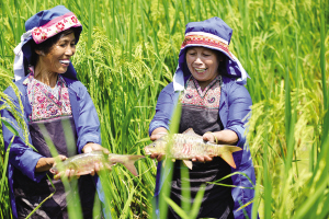 稻田養(yǎng)魚是當(dāng)?shù)囟编l(xiāng)群眾的傳統(tǒng)習(xí)俗,燒魚是侗族的一種傳統(tǒng)美食。“燒魚節(jié)”是當(dāng)?shù)囟弊宓囊豁?xiàng)傳統(tǒng)民俗活動(dòng)。在初秋時(shí)節(jié),當(dāng)?shù)囟弊迦罕婇_田放水,捉魚,全寨男女老少,野外生起篝火烤魚,用燒魚、米酒等祭祀魚神,祈禱魚糧豐收。圖為該寨的侗族群眾在稻田捕魚。