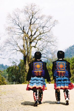 白褲瑤女人身上最惹眼的,除了百褶裙,還有她們衣服背后那一個個大大的方形圖案。傳說900年前,白褲瑤首領有一方皇帝賜給的權印,被女婿以哄孫子為借口,借走并用假印調(diào)了包,瑤族人因此被趕進山里,過起了少田缺水的游耕生活。為了告誡子孫不要忘記因為喪失權力而導致苦難的教訓,從此,白褲瑤就在女人的馬鞍衣后面,繡上了一個形狀像首領印一樣的彩色方塊圖案。這是一種紀念,也是一種懷念。裙擺拂過落葉,一如群蝶穿越花叢。