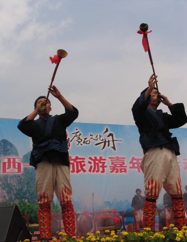 民間娛樂和日常祭祀用的樂器,有長鼓(黃泥鼓)、銅鼓、嗩吶、洞簫、笛子、銅鈴、簡板、長號、牛角、銅鑼和皮鼓等。長鼓、牛角、竹笛等樂器,在宋代的樂器中,已廣泛采用,是十分動(dòng)聽的一種樂奏。牛角,是瑤族特有的古老樂器,演奏時(shí)用以伴奏,其聲“鳴鳴”然,遠(yuǎn)近無不聽聞。長號、銅鑼、鈸、二胡等樂器是外族傳入瑤區(qū)的,他們除了吸取外族演奏的技藝之外,根據(jù)自己的民族特點(diǎn),增添了不少的本民族生活色彩,演奏技巧更為高超,深受群眾歡迎。
