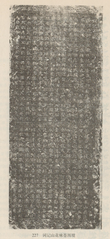白文碑刻。明楊黼作。景泰元年(1450年)立,原嵌于大理縣作邑鄉(xiāng)慶洞莊圣元寺偏殿前廳北壁,后移至大理縣文化館。碑文14行,陰文正體,從右到左直行書寫。首行為題,其余正文,共13行,每行40字,只第9行41字,末行39字。全詩(shī)20節(jié),每?jī)晒?jié)為一聯(lián),共10聯(lián)。前4聯(lián)詠蒼山洱海的自然景色和地勢(shì)名勝,后6聯(lián)抒作者之情感。以白語(yǔ)吟誦,優(yōu)美動(dòng)聽。這是目前保存最為完好的一塊白文碑。傅懋勣、肖雷南在40年代曾根據(jù)郭純?nèi)实淖x音注解此碑,有油印本。石鐘健、楊燦然、徐嘉瑞亦對(duì)此碑加以研究。1957年,徐琳、趙衍蓀以郭純?nèi)首x音為本,用國(guó)際音標(biāo)記音,并加翻譯。《民族語(yǔ)文》1 980年第3期載有釋讀文章。