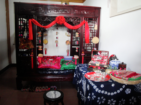 白族婚禮一般要舉行四天,第一天叫“預(yù)喜”,主要是殺豬宰羊,搭彩棚,迎喜神,接月老以及布置客堂、洞房和貼對(duì)聯(lián)等。第二天為“正喜”,嗩吶高奏,鑼鼓喧天,或騎馬或坐轎,迎親隊(duì)伍浩浩蕩蕩到女方家迎新娘,在完成了一系列妙趣橫生的禮儀后,經(jīng)媒人再三催請(qǐng)后,新娘才依依不舍,由其親兄長(zhǎng)背出門。新娘迎出門外后,新姑爺還要專門返回給丈母娘磕頭拜別,意為“回馬謝親”。新娘進(jìn)門時(shí)要跨火盆或馬鞍,表示興旺或平安,有人還要故意在火盆里灑上辣椒面,嗆得大家流淚,白語里“辣”叫“qil”,與“親”諧音,表示以后親親密密。新娘迎進(jìn)門后,拜堂前要梳妝,即女子換頭禮,請(qǐng)年高婦女為新婦梳頭,先戴鳳冠,然后換成紗帕,腳踩裝滿糧食的斗,寓意五谷豐登,魁星踢斗。斗中擺一桿秤,寓意新娘心像秤一樣公平,對(duì)丈夫?qū)Ω改敢灰曂?,又放置一把剪刀,表示新娘?duì)愛情的忠貞不二。第三天回門。新娘清晨早起,在別人幫助下“收頭”,將頭發(fā)梳成高高的髻,作為成人的標(biāo)志,然后由新郎陪同回娘家。新娘手中提著一籃糖果,有花生、瓜子、水果糖之類,路上遇到熟人和小孩,就抓給一把。這天新娘家要辦酒席招待女婿,女婿一一拜見岳家長(zhǎng)輩,新婚夫婦當(dāng)日返回男家。第四天酬客,折彩棚,招待幫忙的客人。