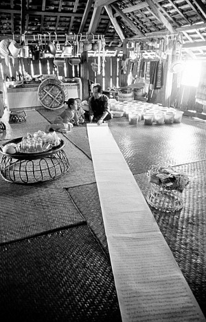 這時,走來一個大佛爺和兩個老人,因為佛祖不會開口說話,他們是來替佛祖給玉波念“薩拉帥”祝詞的。先由大佛爺念了一段《祝福經(jīng)》,給玉波滴了水,然后兩個老人打開玉波那寬半尺、長足有7米多的“薩拉帥”祝詞。玉金說,這祝詞是請曼降村的前大佛爺康朗寫的(康朗:指佛爺還俗的人)。來倆個老人念,是考慮到可以換著念。玉波的奶奶也想到了玉波可能跪不習(xí)慣,就帶來了墊子,讓玉波或跪或坐,因為念完祝詞要兩三個小時。祝詞的內(nèi)容大致是這樣的:“我是一個在菩提樹下長大的女孩,在佛祖的護蔭下,臉長得像菩提樹葉一樣又嫩又青,身材像檳榔樹一樣苗條好看,心像金鹿一樣善良。當(dāng)我年滿12歲以后,人世間的喜樂情愛,貧窮苦難就會來到我的面前。今天在父母的幫助下,我準備了這些物品來賧給佛祖。我千祈禱萬祈求,希望佛祖保佑我織布是行家,丈夫種田是能手。命里見火能親,遇水能溶。生的孩子女的長得像一只蜜蜂,男的長得像一頭水牛,用他們的勤勞贍養(yǎng)雙親。從小就聽話,自幼就很乖。在母親的懷里不亂哭,在父親的背上不亂搓……”